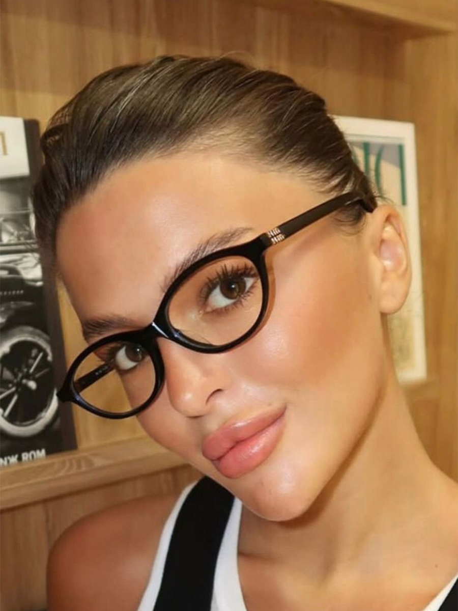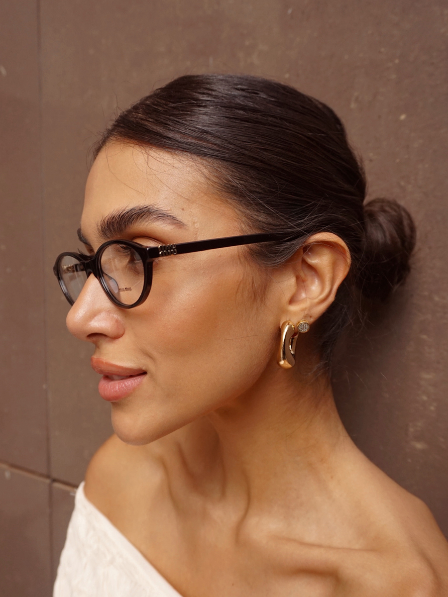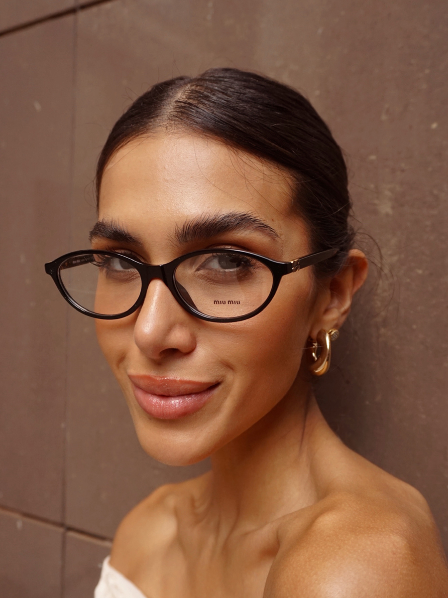 Equilibrando perfeitamente a modernidade e o glamour, este modelo de grau ostenta um formato oval estreito. Em contraste com os volumes finos de acetato, o logo vertical de metal é uma característica de destaque, bem como uma articulação funcional. Um design de grau estreito oval de acetato com detalhes de metal que trazem a articulação com o logo vertical da Miu Miu e um revestimento nas ponteiras.